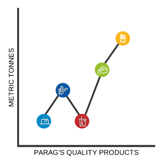 At Pride of Cows we ensure the cows well-fed and are eating well-balanced meals as per their nutritional needs and requirements, milk production, body weight, location and age. The idea is to pamper the cow because only when a cow is happy will it yield the necessary high quality milk. The parent company Parag Milk Food's product portfolio includes milk, skimmed milk powder, whole milk powder, ghee, processed cheese, butter, dahi, proprietary foods like dairy whitener and gulab jamun mix powder under the brand names of Go and Gowardhan.